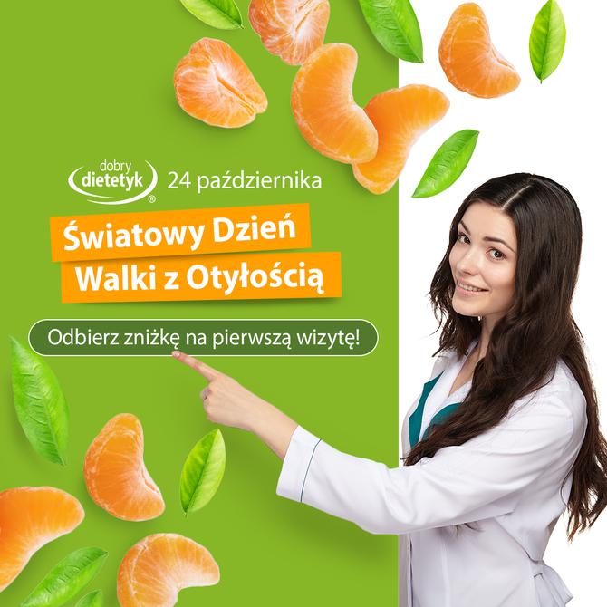 W związku ze zbliżającym się dniem walki z otyłością serdecznie zapraszam do skorzystania z promocji w ramach pierwszej konsultacji,po której skomponuje indywidualny program żywieniowy, dopasowany do obranego przez nas celu. Każdy kto zapisze się na pierwszą wizytę otrzyma rabat w wysokości 50zł.