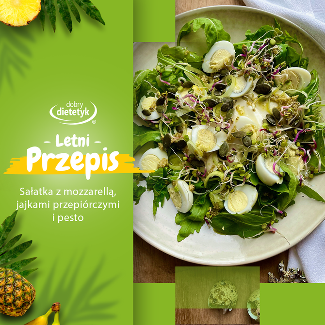 Jaja ugotować na twardo, obrać i pokroić. Na talerzyk rozłożyć rukolę, plastry mozzarelli, jajka, kiełki i kawałeczki pora. Posypać pestkami i skroić pesto wymieszanym z oliwą.