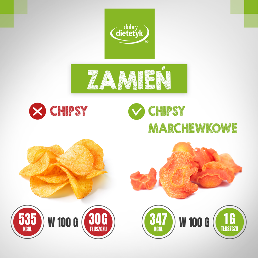 Jeśli masz ochotę na słoną przekąskę, warto sięgnąć po zdrowszą wersję chipsów jak np. chipsy marchewkowelub przygotować samemu pokrojone warzywa i upiec w piekarniku.